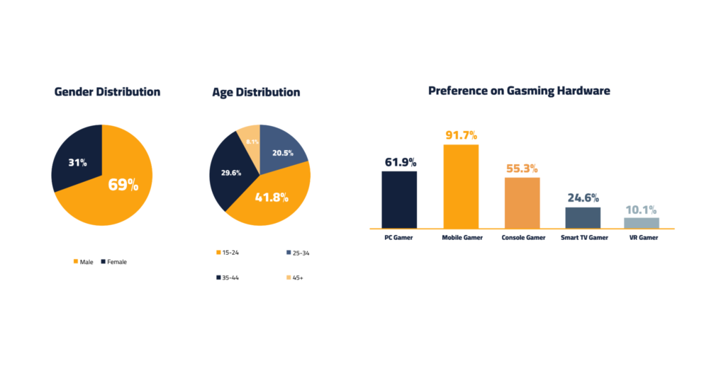 The GCC gaming audience predominantly comprises young males, with 69% identifying as male and 62.3% under the age of 34. Mobile gaming dominates the landscape, engaging 91.7% of players, followed by PC (61.9%) and console gaming (55.3%). Emerging platforms, including smart TVs (24.6%) and virtual reality (10.1%), are gaining traction.